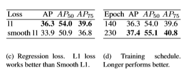 vanilla L1 loss를 Smooth L1에 비교한다. L1보다 Smooth L1이 좋다.
