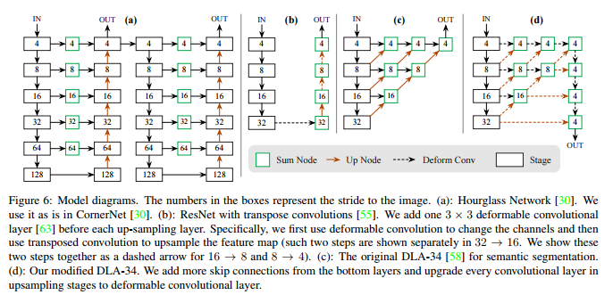 이 논문은 ResNet-18, ResNet101, DLA-34, Hourglass-104의 4 가지 아키텍처를 실험한다. deformable convolution layer를 사용하여 ResNet과 DLA-34를 수정하고 Hourglass network를 그대로 사용한다.