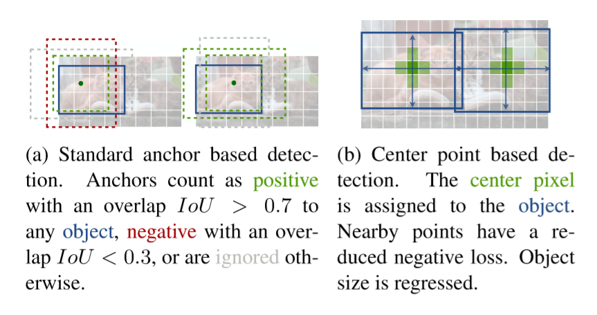 CenterNet은 box의 겹침이 아닌 위치에 기반하여 “anchor”를 할당한다. foreground와 background에 대한 임계값이 없다.