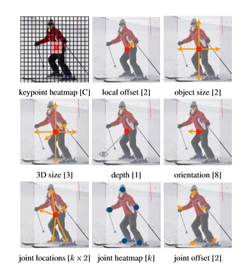 이 논문은 각 중심점에서 추가적인 출력을 예측하여 3D object detection 및 다중 사람 자세 추정에 대한 실험을 제공한다. 3차원 bounding box를 추정하기 위해서 object의 깊이, 3D bounding box의 크기, object의 방향을 회귀한다.