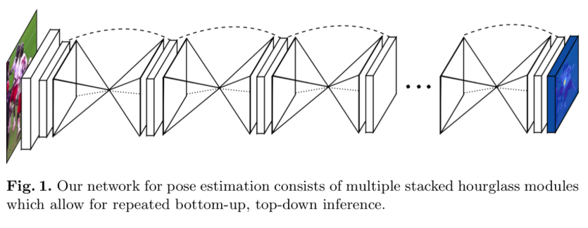 Hourglass Network는 input을 4배씩 downsampling하고 순차적인 두개의 Hourglass modules을 따른다. 각 Hourglass modules는 skip connection을 사용하는 대칭 5 layer down- and up-convolution network다. 이 네트워크는 꽤 큰 모델이지만 일반적으로 최상의 keypoint 추정 성능을 가지고 있다.