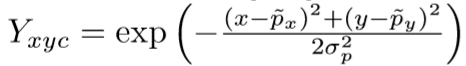 - keypoint heatmap : \(\hat{Y} \in [0, 1]^{(\frac{W}{R} * \frac{H}{R} * C)}\)