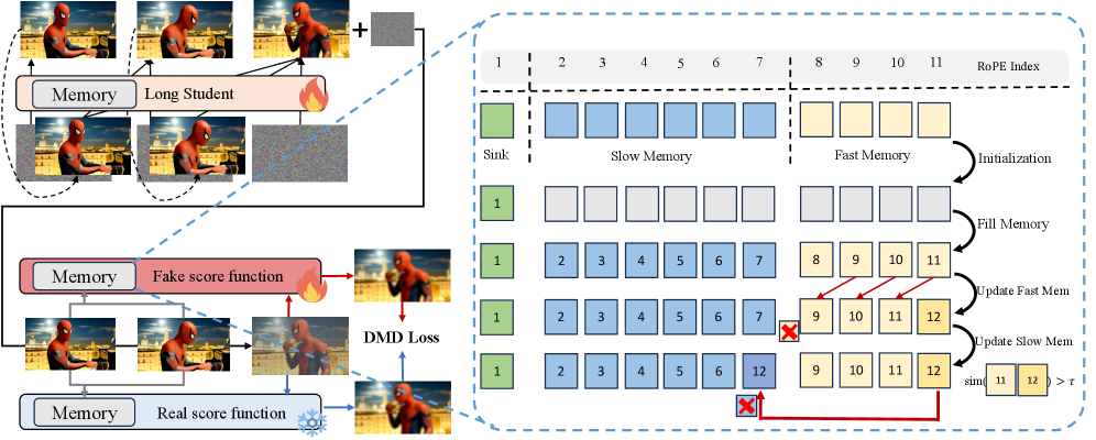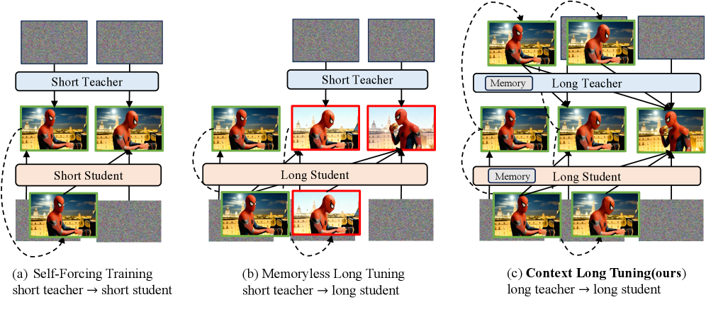 위 그림에서 알 수 있듯이, 기존의 LongLive와 같은 방식은 Student가 긴 구간을 생성하려 해도 Teacher 자체가 5초 분량의 윈도우만 볼 수 있는 ‘Memoryless’ 상태였기 때문에, Student에게 장기적인 일관성을 가르칠 방법이 없었습니다. 이는 마치 단기 기억 상실증에 걸린 스승이 제자에게 대서사시를 쓰라고 가르치는 것과 같습니다. 제자는 스승의 가이드에 따라 문장은 유려하게 쓰겠지만, 소설 전체의 줄거리는 엉망이 될 수밖에 없습니다.