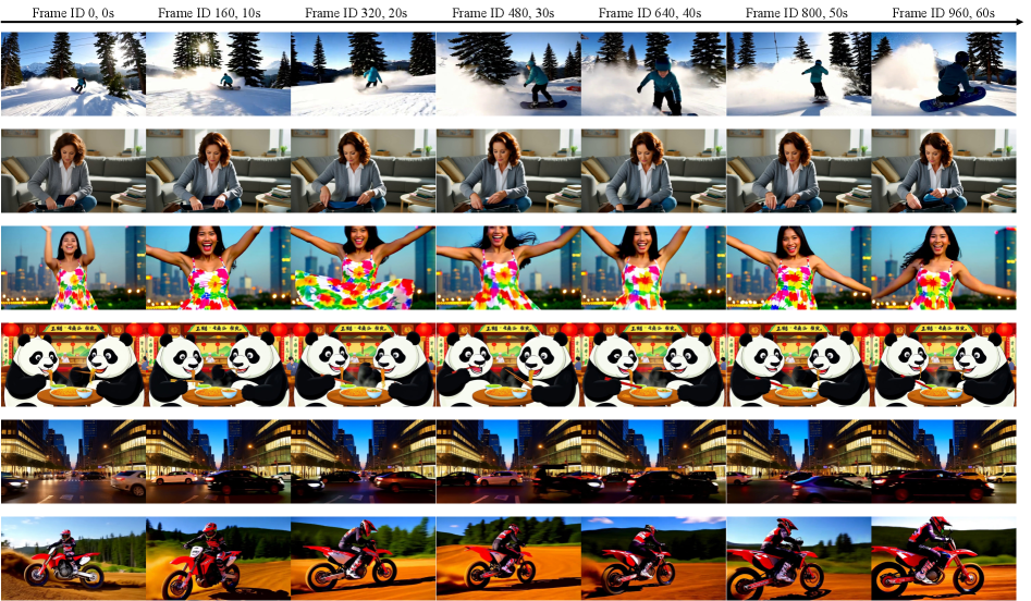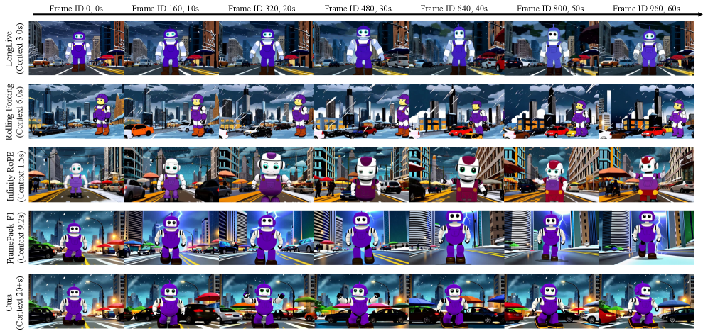 그림 4: 1분 분량 비디오 생성 비교. 타 모델들은 시간이 지남에 따라 피사체의 형태가 변하거나 배경이 무너지지만, Context Forcing은 일관성을 유지한다.