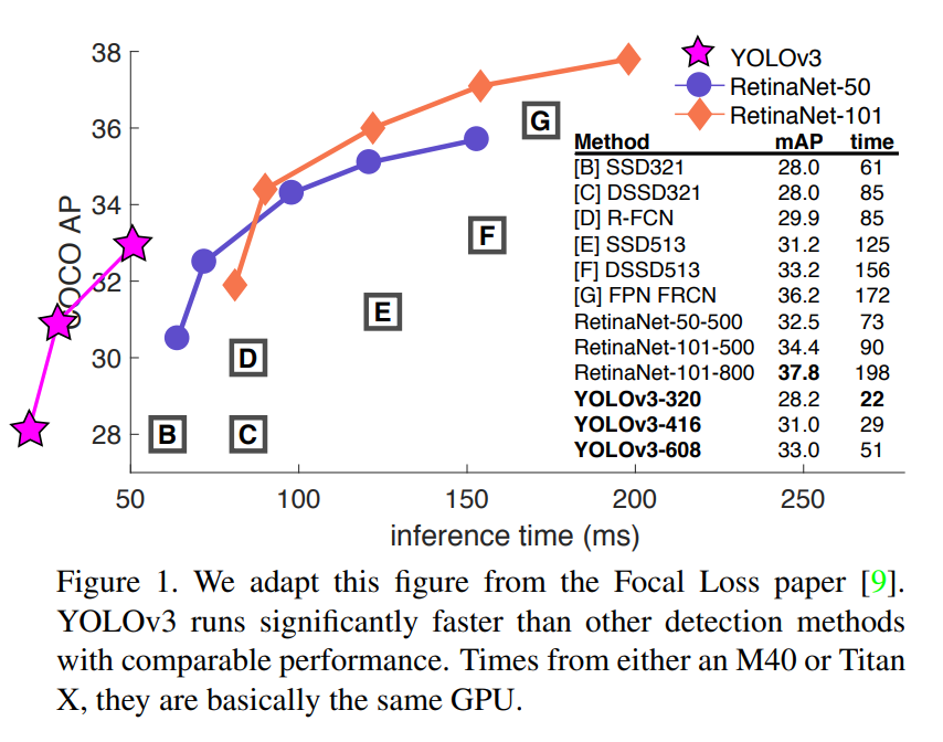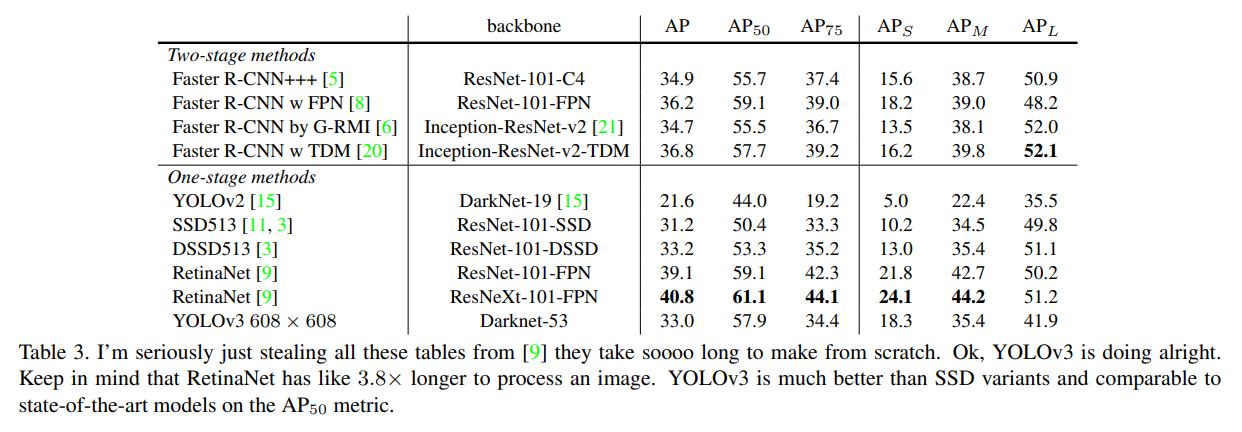 IOU = 0.5에서 AP50를 볼때 YOLOv3는 강력합니다.- IOU의 threshold가 증가하면 Object와 Box를 완벽히 정렬하는데 어려움을 겪어 성능이 급격히 떨어집니다.