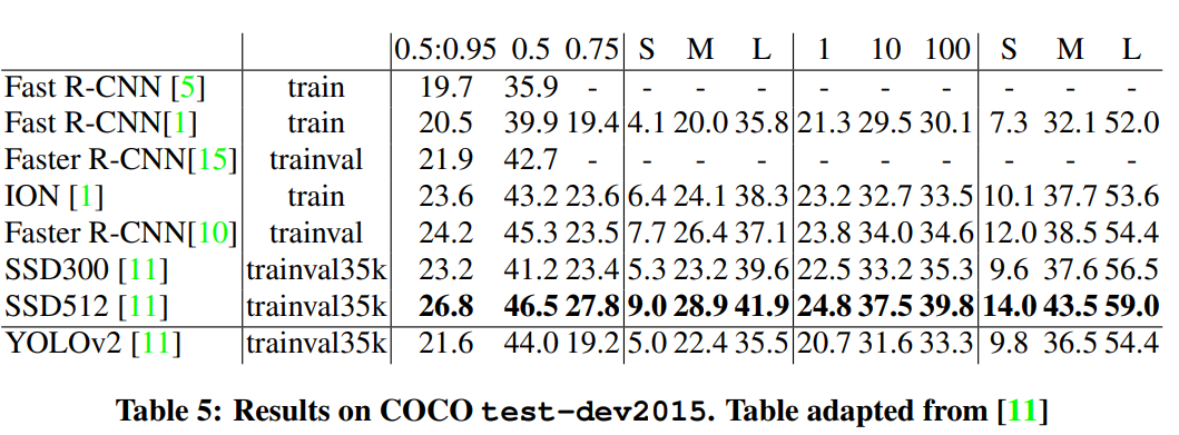 - COCO의 이상한 mAP를 사용하면 SSD 변형과 동일하지만 3배는 빠릅니다. 하지만 이러한 측정법으로 RetinaNet과 같은 모델보다 약간 성능이 좋지 않습니다.