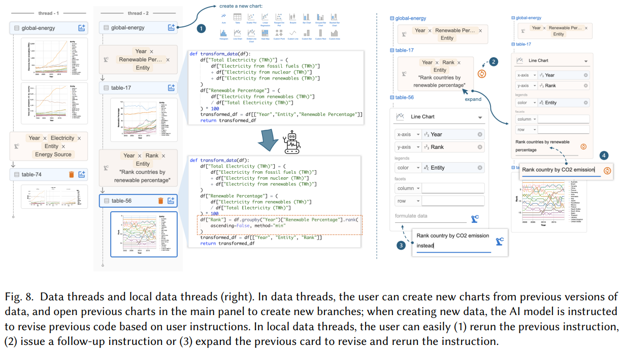기존 AI 기반 데이터 분석 툴들은 비선형적 데이터 탐색을 지원하지 않아 분석 과정에서 여러 차트 버전을 만들기가 어려웠습니다. Data Formulator 2는 “Data Threads” 기능을 제공하여, 사용자가 이전 차트를 손쉽게 재사용하고 수정할 수 있도록 지원합니다.