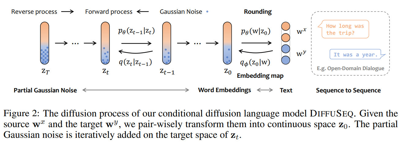 \[p_{\text{diffusion}}(w^y|w^x) = \int_{y_T,...,y_0} p(w^y|y_0, w^x) \prod_{t=T,...,1} p(y_{t-1}|y_t, w^x)\]연속 공간과 이산 토큰을 연결하는 라운딩 연산을 추가하면: