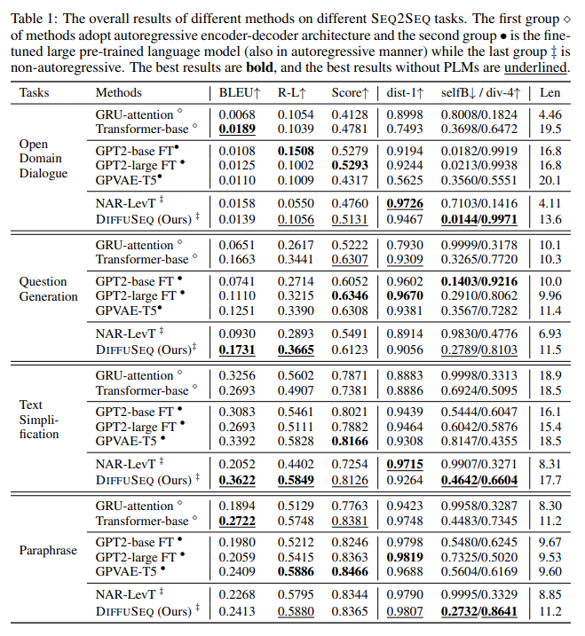 - 품질: DiffuSeq는 대부분의 태스크에서 비교군과 동등하거나 더 나은 품질 점수를 달성