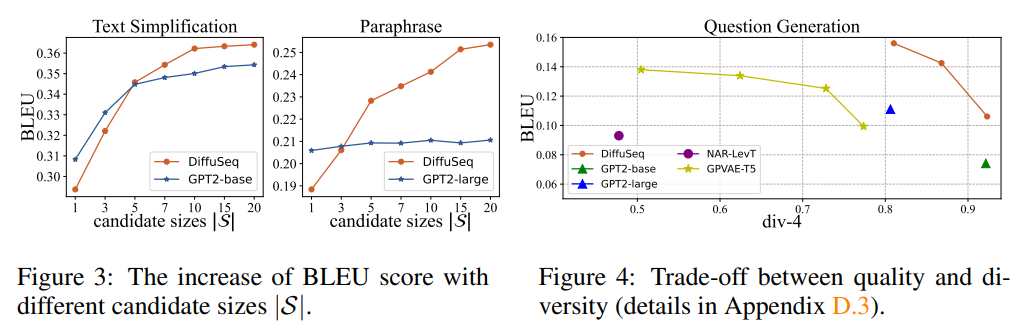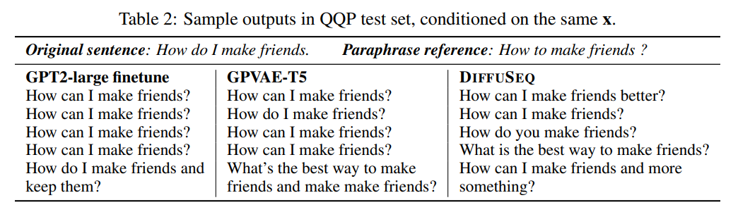 - DiffuSeq는 유사한 품질 수준을 유지하면서 훨씬 더 다양한 출력을 생성