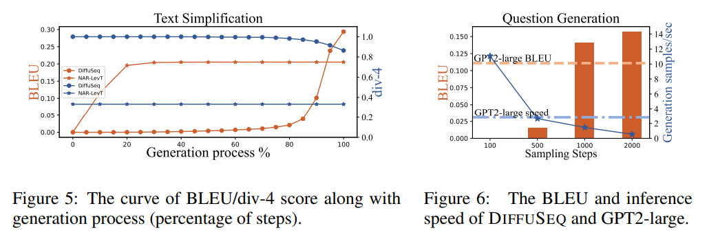- 확산 단계를 2,000에서 1,000으로 줄여도 GPT2-large보다 높은 BLEU 점수 유지