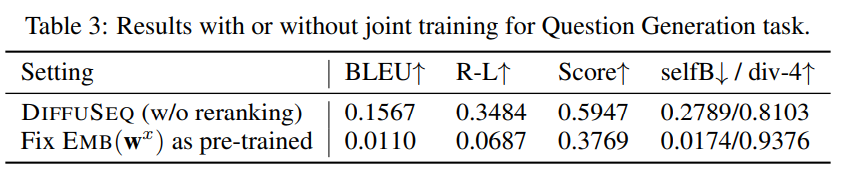 - 이는 DiffuSeq의 공동 학습 접근법의 중요성을 보여줌