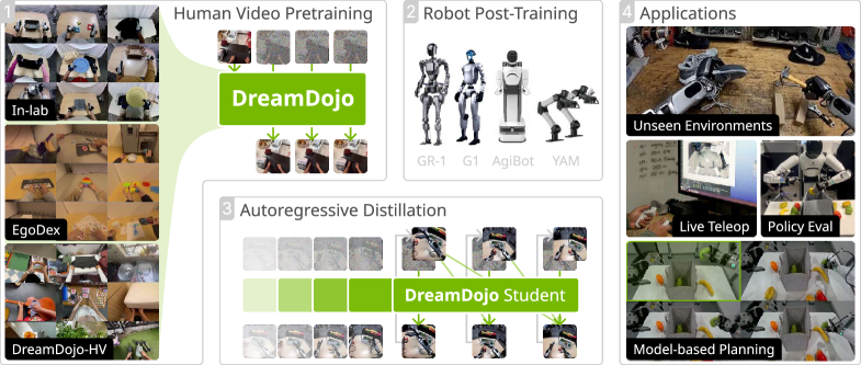 그림 1: DreamDojo의 전체적인 개요. 대규모 인간 데이터를 통해 물리 지식을 습득하고, 로봇 데이터를 통한 사후 학습 및 증류 과정을 거쳐 실시간 제어가 가능한 월드 모델로 거듭납니다.