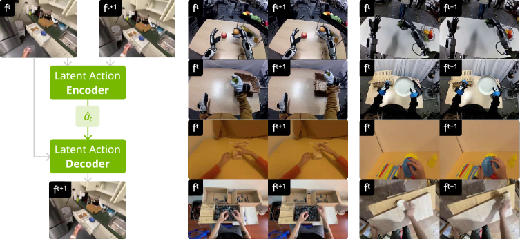 LAM은 두 프레임 ($s_t, s_{t+1}$)을 입력받아 잠재 벡터 $a_t$를 생성합니다. 이때 핵심은 정보 병목(Information Bottleneck) 설계입니다. 모델이 다음 프레임을 재구성할 때, 너무 많은 정보를 잠재 벡터에 담지 못하게 제한함으로써 모델이 배경이나 물체의 질감 같은 정보가 아닌, ‘물체가 어떻게 움직였는가’라는 핵심적인 행동 특성만을 포착하도록 강제합니다.
