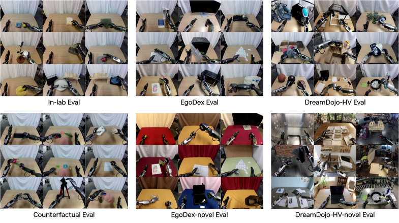 그림 4: 벤치마크 시각화. DreamDojo의 일반화 능력을 테스트하기 위해 구축된 다양하고 도전적인 환경들.
