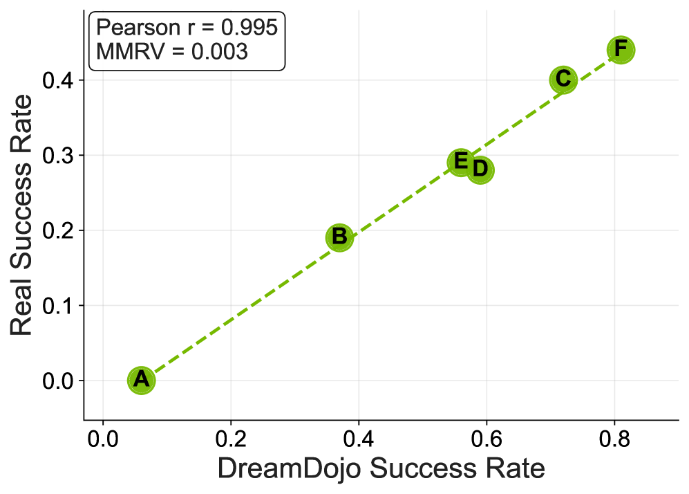 그림 5는 DreamDojo가 구축한 가상 세계에서의 정책 평가 결과가 실제 세계에서의 결과와 얼마나 일치하는지를 보여줍니다. 두 지표 사이의 상관관계가 매우 높다는 것은 DreamDojo를 이용한 가상 평가가 실제 로봇 배포 전의 ‘디지털 트윈’으로서 충분히 기능할 수 있음을 입증합니다.