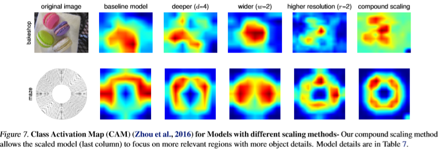 기존 방법에 비해 compound scaling을 사용하면 맨 마지막 열에 있는 그림과 같이 매우 class의 형태를 잘찾는 것을 알 수 있다. CAM에 대해서는 흥미가 있어서 포스트를 작성해볼 예정이다.