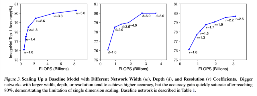 이 그래프는 depth, width, resolution을 각자 올려보면서 성능을 평가한 것이다. 커질수록 올라가지만 어느지점에서 한계가 보인다.