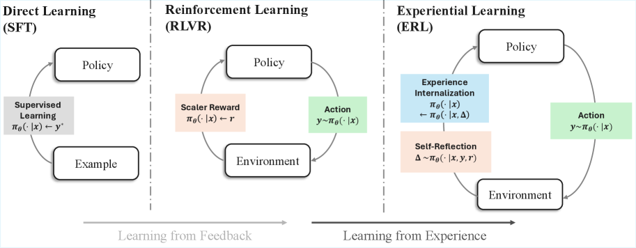 그림 1: ERL은 피드백으로부터 직접 배우는 대신, 경험과 결과를 언어적으로 성찰하고 이를 행동 변화로 내재화하는 과정을 거칩니다.