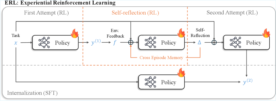 그림 3: ERL의 전체 개요. 첫 번째 시도와 성찰, 두 번째 시도가 모두 강화학습으로 최적화되며, 특히 성공한 두 번째 시도는 자기 증류를 통해 모델에 내재화됩니다.