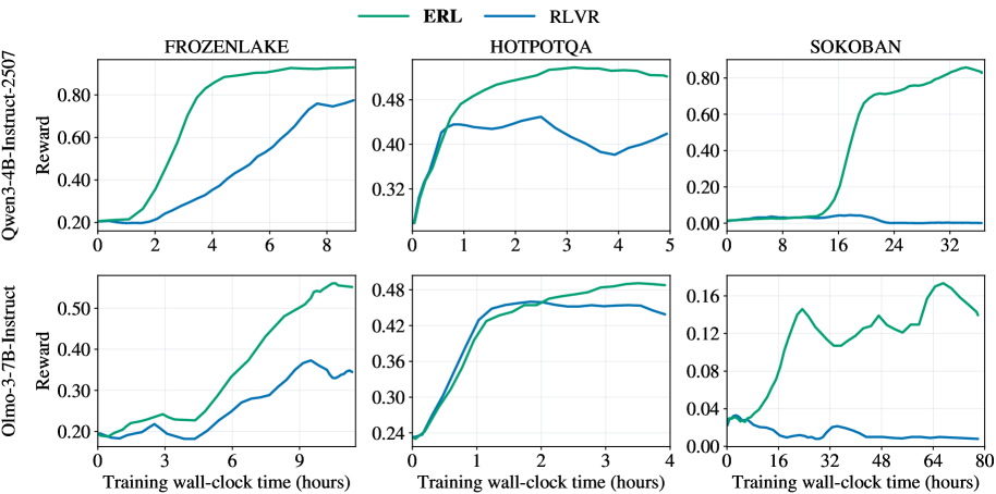 그림 4: 학습 시간 대비 검증 보상 궤적. ERL은 모든 작업에서 RLVR보다 압도적으로 빠른 수렴 속도와 높은 보상을 보여줍니다.