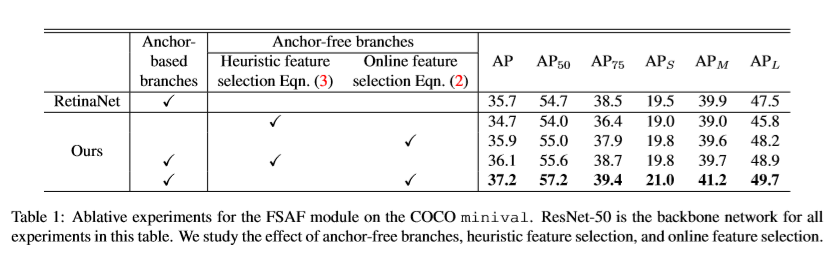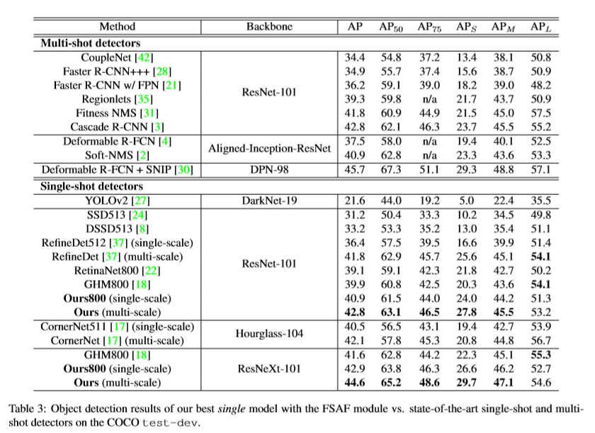 anchor-based의 한계를 극복하기 위해 FSAF 모듈을 제안하였고 작은것을 추론하는 것을 크게 개선하고 최신 detector보다 성능이 뛰어나다.