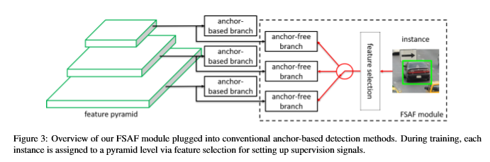 FSAF의 목표는 각 instance가 네트워크를 최적화하기 위해 최상위 수준의 feature를 자유롭게 선택할 수 있도록 하는 것이므로 모듈에서 feature 선택을 제한할 anchor box가 없어야 한다는 것 이다.