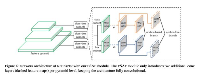 RetinaNet에 연결하면 FSAF모듈과 anchor-based branch가 함께 동작한다. anchor-based branch는 원본과 동일하게 동작하고 모든 하이퍼 파라미터는 학습과 추론에서 변경되지 않는다.