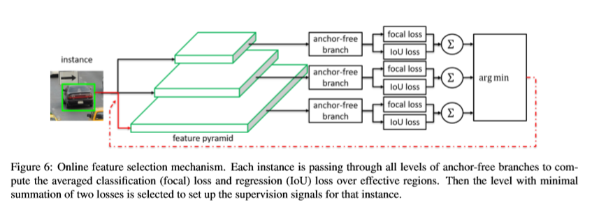 anchor-free branch의 설계를 통해서 임의의 pyramid level \(P^l\)의 feature를 사용해서 각 instance를 학습 할 수 있다. instance box 대신 instance content를 기반으로 최적의 \(P^l\)을 선택한다.