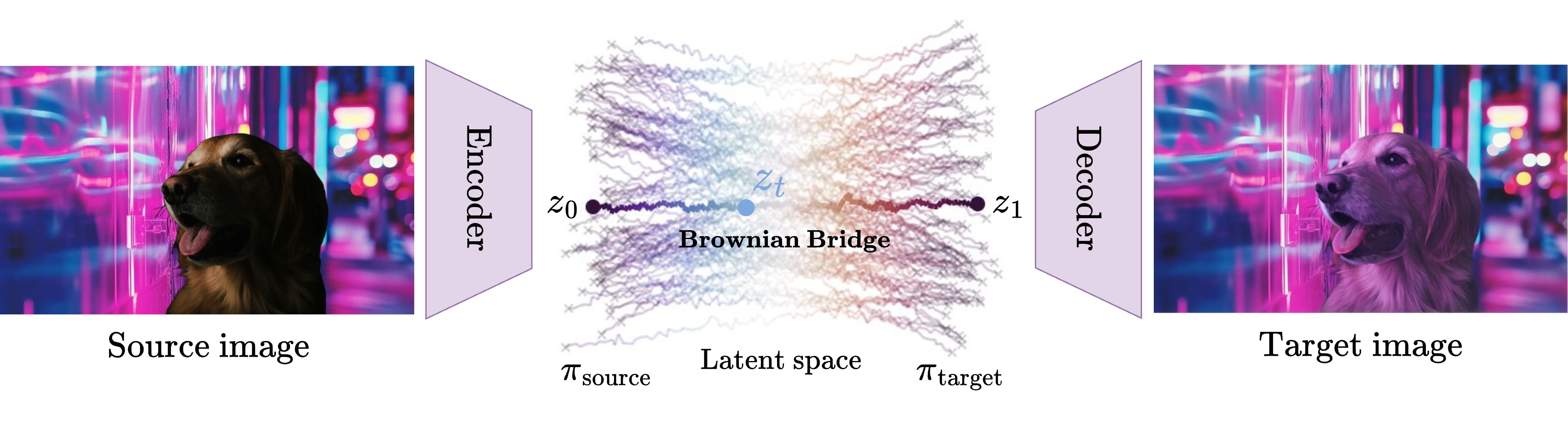 잠재 공간에서의 브릿지 매칭: 잠재 공간에서 두 벡터 사이의 경로 계산 \(z_t = (1-t)z_0 + tz_1 + \sigma\sqrt{t(1-t)}\epsilon\)