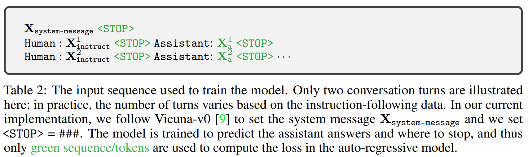 멀티모달 명령 데이터로 학습하는 자기회귀(auto-regressive) 방식: \(p(X_{\alpha}|X_v, X_{instruct}) = p_{\theta}(x_i|X_v,X_{instruct,<i}, X_{\alpha,<i})\)