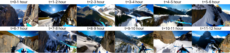 Figure 1: 12시간 동안 생성된 윙수트 플라이어 영상의 스틸컷. 시간이 지나도 지형의 논리적 구조와 물리적 움직임이 유지됩니다.