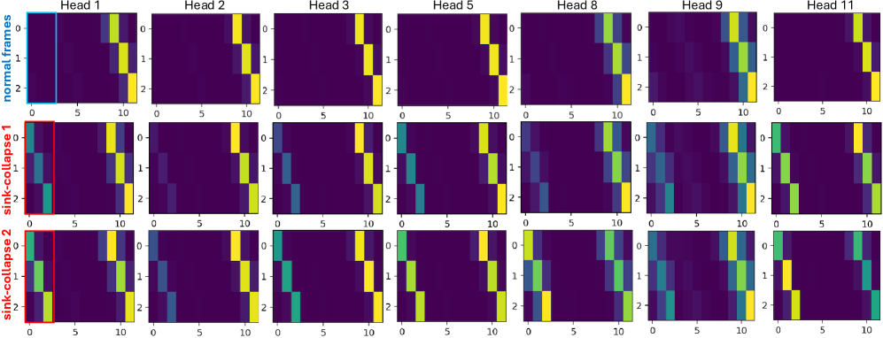 Figure 3: 어텐션 헤드 간 동질화 현상 시각화. 하단 두 줄에서 보듯, 특정 시점에 여러 헤드가 동시에 싱크 프레임에 과도한 가중치를 할당하며 장면 붕괴가 일어납니다.