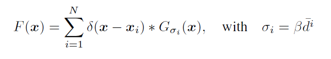 주어진 이미지에서 각 머리 xi에 대해, 논문은 그것의 가장 가까운 이웃에 대한 거리를 {d1,d2,d3 ‘’’} 로 표현한다. 따라서 xi와 관련된 픽셀은 di에 비례하는 반경에서 지면상의 영역에 해당합니다. 그러므로 di에 비례하는 분산 σi를 갖는 Gaussian kernel로 σ(x-xi)를 컨볼루션 할 필요가 있다. 보다 정확하게 밀도 F는 어떤 파라미터 β에 대한 것이어야 한다. 다시 말하면 지리 정보 적응형 커널이라고 불리는 각 데이터 포인트 주변의 local geometry에 적응할 수 있는 밀도 커널로 label H를 컨볼루션합니다. 결과적으로 β = 0.3이 가장 좋은 결과를 제공한다는 것을 발견 했다.