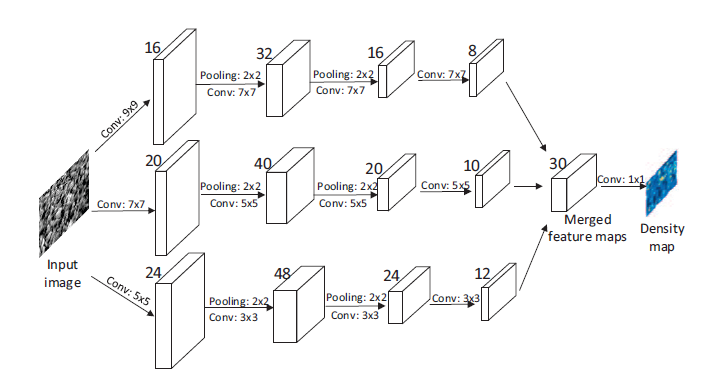 원근 왜곡으로 인해 이미지들은 크기가 매우 다른 머리를 포함하므로, 동일한 크기의 receptive field가 있는 필터는 서로 다른 스케일의 군중 밀도의 특성을 포착할 수 없을 것이다. 그러므로, Density maps의 raw pixel로 부터 map을 학습하기 위해 다른 크기의 local receptive field를 사용하는 것이 더 자연스럽다.