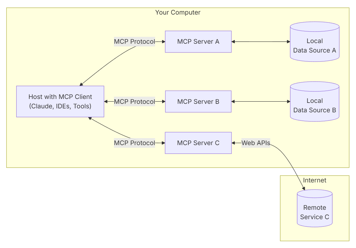 쉽게 비유하자면, MCP는 AI 세계의 HTTP 프로토콜 또는 USB-C 포트와 같습니다. 웹 브라우저와 서버가 HTTP를 통해 소통하듯, AI 모델과 다양한 데이터 소스가 MCP를 통해 원활하게 연결됩니다. 이를 통해 개발자는 ChatGPT, Claude, Gemini와 같은 AI 모델이 내부 데이터베이스, API, 파일 시스템 등 다양한 정보 소스에 접근할 수 있게 할 수 있습니다.
