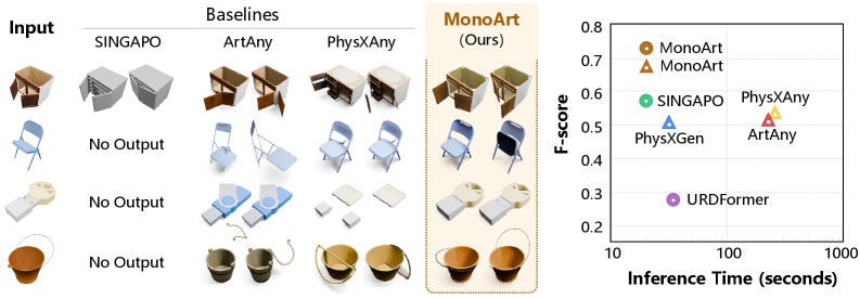 - [그림 설명] (우측 그래프 주목) PartNet-Mobility 벤치마크에서의 추론 시간 대비 F-Score 비교입니다. MonoArt가 압도적으로 좌측 상단(빠르고 정확함)에 위치해 있는 것을 볼 수 있습니다.