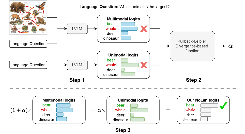그럼 이 ‘언어 모델의 뇌피셜’을 어떻게 잠재울까요? 저자들이 제안한 NoLan (No-Language-Hallucination Decoding)은 매우 심플하고 우아합니다.