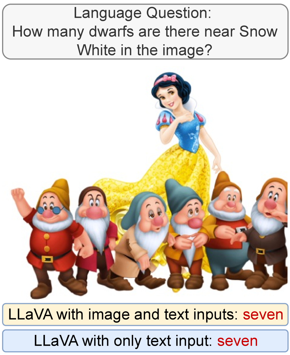 저자들의 뼈 때리는 예시. 이미지를 안 보고도 ‘일곱’ 난쟁이라고 우기는 언어 모델의 똥고집을 잘 보여줍니다.