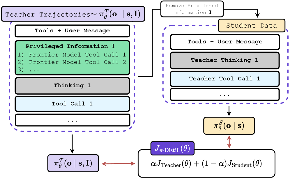 본 논문은 ‘Privileged Information(PI)’이라는 개념을 언어 모델 학습에 도입합니다. PI란 “학습 시점에는 가용하지만 추론(Inference) 시점에는 사용할 수 없는 정보”를 의미합니다. 예를 들어, 미래의 성공적인 행동 궤적, 환경의 숨겨진 상태값, 혹은 교사 모델의 도구 호출(Tool call) 기록 등이 이에 해당합니다.