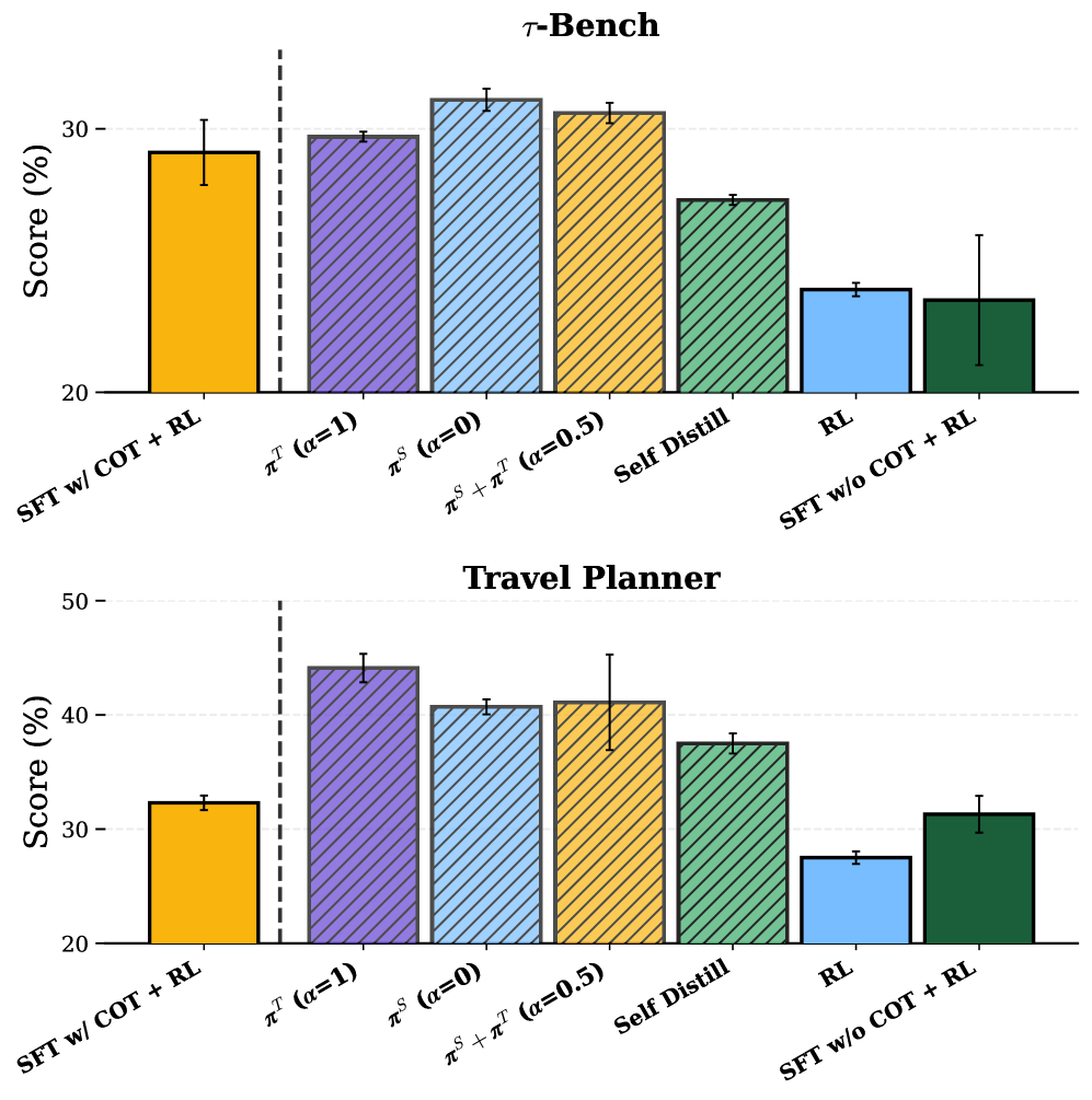 Figure 2: TravelPlanner 및 τ-Bench에서의 성능 비교. π-Distill과 OPSD가 기존 SFT+RL 방식을 크게 앞지릅니다.