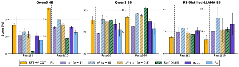 Figure 4: GEM 벤치마크 결과. π-Distill은 표준 RL에 비해 지식 유지 능력이 탁월하며, SFT w/ CoT보다 높은 일반화 성능을 보여줍니다.