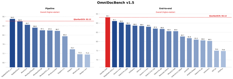 Figure 1: OmniDocBench v1.5 성능. 오른쪽의 빨간 막대가 Qianfan-OCR입니다. 무거운 파이프라인 모델(왼쪽)과 맞먹거나 압도하는 퍼포먼스를 보여줍니다.
