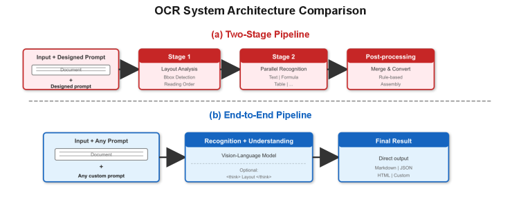 Figure 3: 기존의 지저분한 2단계 파이프라인(a)과 Qianfan-OCR의 단일 모델 접근법(b). 시각적 컨텍스트 유실 없이 프롬프트만으로 태스크를 제어하는 구조가 핵심입니다.