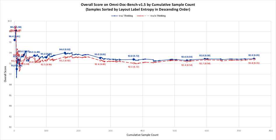 Figure 4: 레이아웃 엔트로피에 따른 누적 점수 변화. 복잡한 문서(왼쪽)에서는 Think 모드가 압도적이지만, 단순한 문서가 포함될수록(오른쪽) 오히려 No-Think 모드의 점수가 높아집니다.