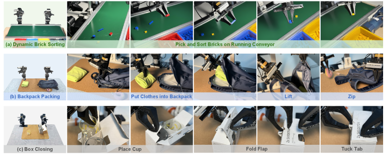 - Backpack Packing: 배낭을 열고, 옷을 넣고, 들어 올린 뒤 지퍼를 채우는 복합적인 과정입니다. 유연 물체(Deformable objects) 조작 능력이 필수적입니다.