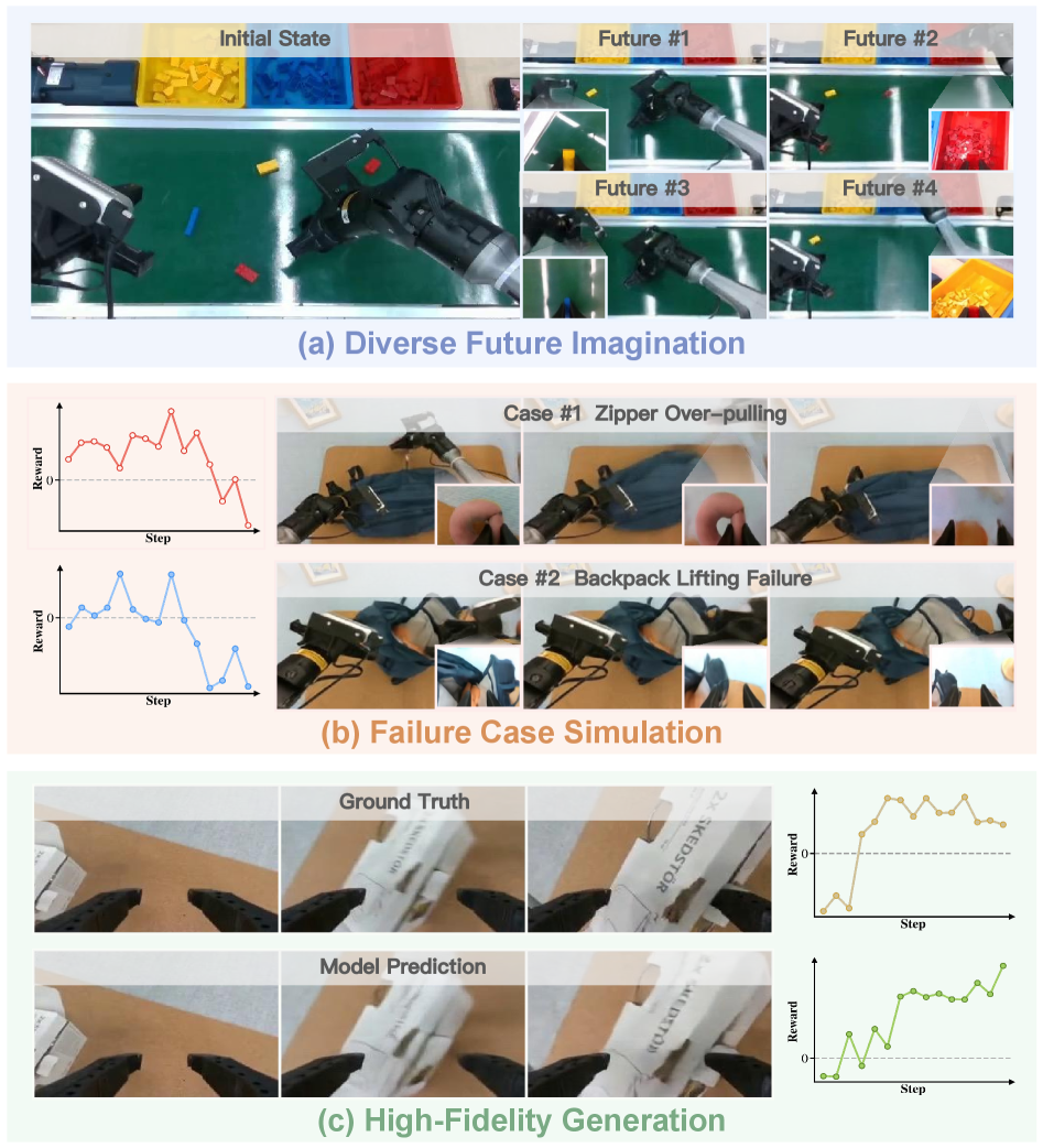 - Controllable Dynamics Model (동역학 모델): 멀티뷰 카메라 입력과 로봇의 행동(Action chunks)을 받아 미래의 시각적 변화를 예측합니다. 여기서 Diffusion Transformer(DiT) 기반의 아키텍처를 사용하여 시공간적으로 일관된 고화질 영상을 생성합니다.