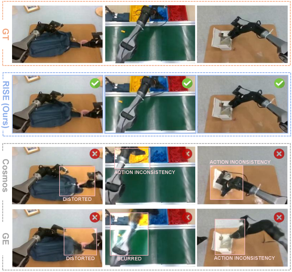 RISE의 동역학 모델은 기존의 Cosmos나 Genie Envisioner와 같은 최신 비디오 생성 모델과 비교했을 때 물리적 일관성 면에서 월등한 성능을 보입니다. 기존 모델들이 물체의 형태가 일그러지거나 동작이 흐릿해지는(Motion blurring) 반면, RISE는 멀티뷰 시점 간의 정합성을 유지하며 매우 사실적인 상상을 수행합니다.
