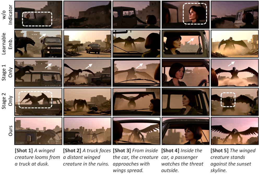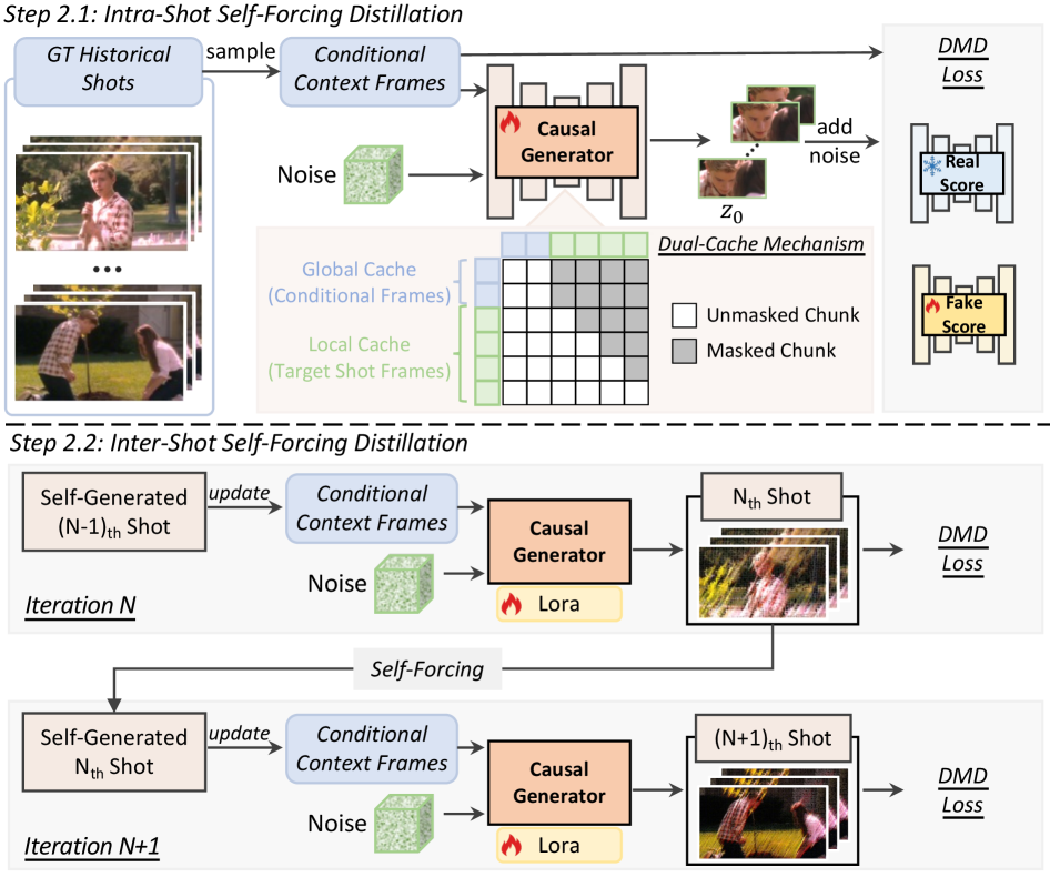 그리고 증류 과정도 예술입니다. 단순히 교사의 아웃풋을 따라 하는 게 아니라 2단계 증류 전략을 씁니다. 1단계(Intra-shot)에서는 완벽한 정답 역사(Ground-truth)를 주고 훈련시키다가, 2단계(Inter-shot)에서는 모델 스스로가 만든 엉망진창인 과거 프레임을 기반으로 다음 샷을 만들게 강제합니다. 실무에서 뼈저리게 겪는 Train-Test Gap(학습과 실제 추론 시의 환경 차이)을 기가 막히게 메워버리는 거죠.