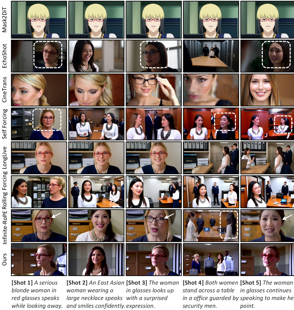 글로벌 캐시는 이전 샷의 핵심 프레임을 쥐고 있고, 로컬 캐시는 지금 렌더링 중인 샷의 프레임들을 기억합니다. 흥미로운 건 이 두 캐시가 섞이면서 발생할 수 있는 위치 정보의 혼란을 막기 위해 RoPE 불연속성 지시자(RoPE discontinuity indicator)를 도입했다는 점입니다. 어텐션 레이어가 과거와 현재를 헷갈리지 않게 멱살을 잡고 가이드하는 역할을 하죠.